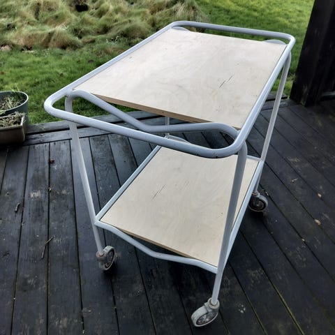 Vintage træbord med rundt bakke og ekstra hylde