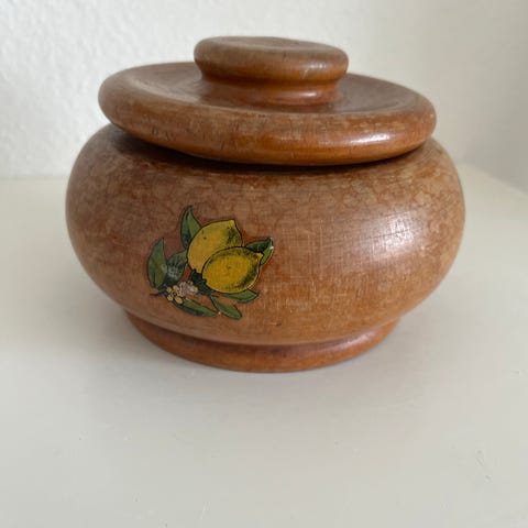 Gammel Træ skrin, med motiver på i god stand som måler 20 x 12 cm og 8 høj.