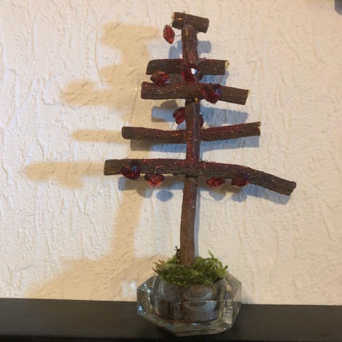 Søde små vaser, dreng og pige står op af træstamme. Vaserne er 11 cm høje og 8 cm bred de røde kunstige blomster medfølger.