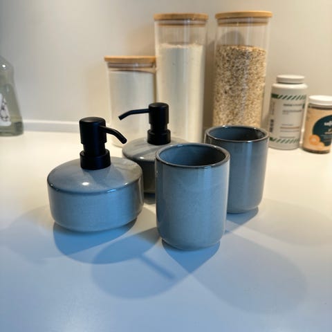 Tvålsjön sæbedispenser og tandkrus fra Ikea.