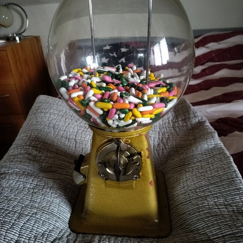 Pez vintage slikautomat fra Tyskland. Formentlig fra 60’erne. Måler 72 cm i højden. Fremstår med brugsspor og mangler knapperne under det lille udhæng.
