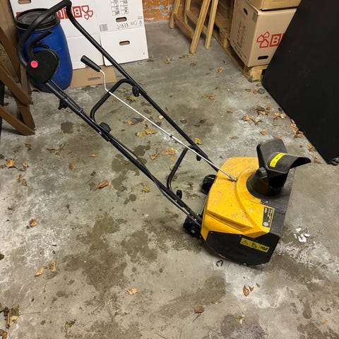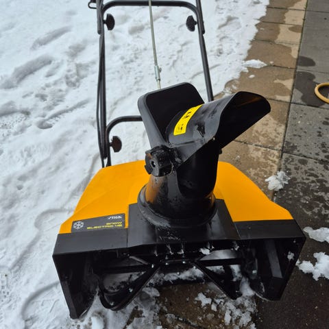 Stiga elektrisk snefjerner med sort og gul farve. Maskinen er designet til effektiv fjernelse af sne på mindre områder og har en kompakt størrelse for nem håndtering.