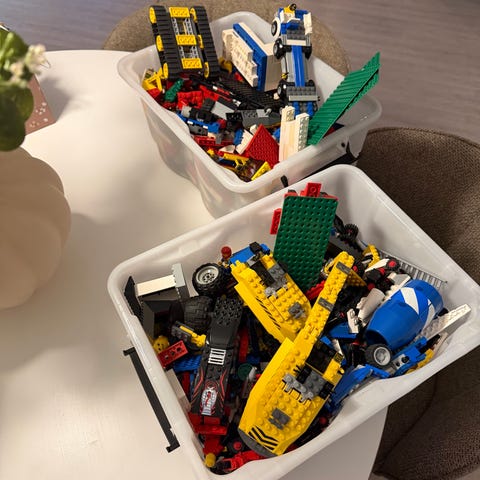 Masser af godt LEGO med forskellige byggeklodser og figurer. Indeholder en blanding af klodser i flere farver og størrelser, opbevaret i en gennemsigtig plastbeholder. Sættet kan bruges til kreativ leg og konstruktion.
