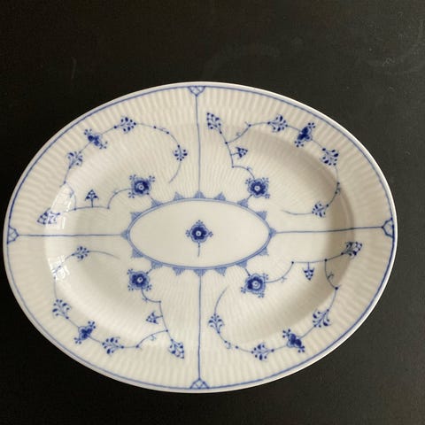 Royal Copenhagen Musselmalet tallerken med klassisk blått blomstermønster på hvit bakgrunn. Tallerkenen er laget av porselen og egnet til servering av mat.