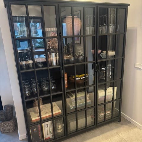 Det flotte vitrineskab er fremstillet i sortlakeret jern og glas, hvilket giver det et råt, industrielt og charmerende udtryk.