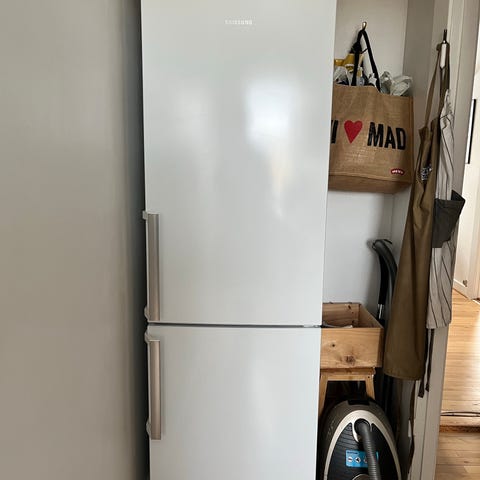 Samsung køle-fryseskab i hvid farve. Modellen har separate rum til køl og frys med flere hylder og skuffer til opbevaring. Køleskabet har lidt skrammer hist og her, men virker optimalt.