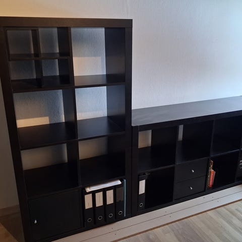 IKEA reol med flere rum, herunder åbne hylder og låger. Møblet er sort og egnet til opbevaring af bøger og andre genstande i stuen eller kontoret.