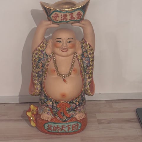 Buddha figurine med guldhat, farverige beklædning og perlekæde. Figuren forestiller en smilende Buddha med armene løftet og en stor mave. Den er dekoreret med kinesiske tegn og har en detaljeret, farverig overflade. Velegnet som dekorativ genstand i hjemmet.