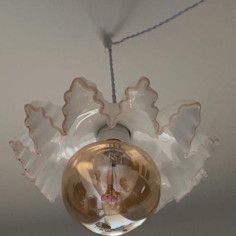 Meget smuk lilla vintage loftlampe/pendel i presset glas med bølget kant fra omkring 1960’erne. Messingophæng og snoet stofledning.