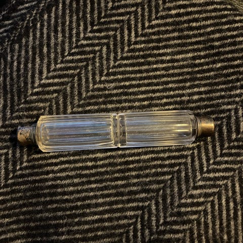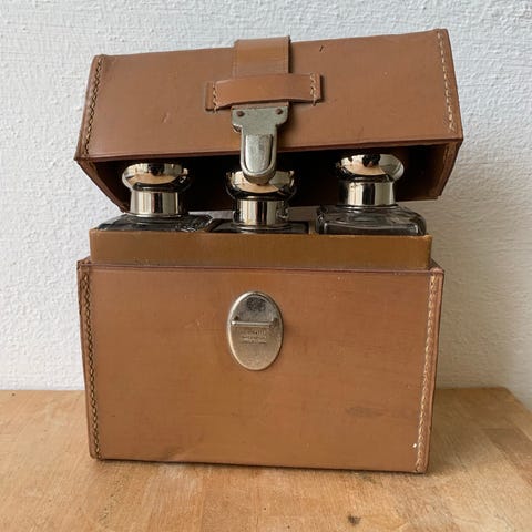1. Æske med broderi indeholdende næsten fyldt parfumeflaske, tre små flakoner af glas samt en metal beholder til flakon. En af glas flakonerne mangler skruelåg.