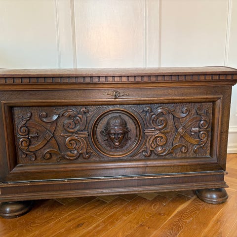 Antikt trækommode med tre spejle, to skabe og en skuffe. Kommoden har dekorative udskæringer og en klassisk stil. Velegnet til opbevaring og som sminkebord.