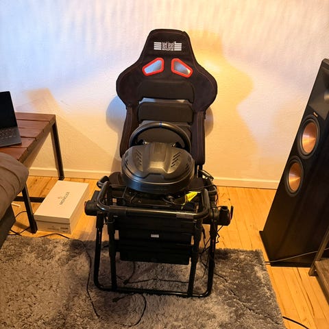 Leoxz XF1 PRO Racing Cockpit med tre skærme, racerrat og pedaludstyr. Cockpittet er designet til racing-simulering og indeholder justerbart sæde, avanceret rat med display og flere kontrolknapper samt et robust pedal-setup. Velegnet til brugere, der ønsker en realistisk køreoplevelse i simracing.