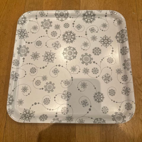 IKEA bakke med farvede dyremotiver og geometriske mønstre. Lavet af plast med en hvid kant.