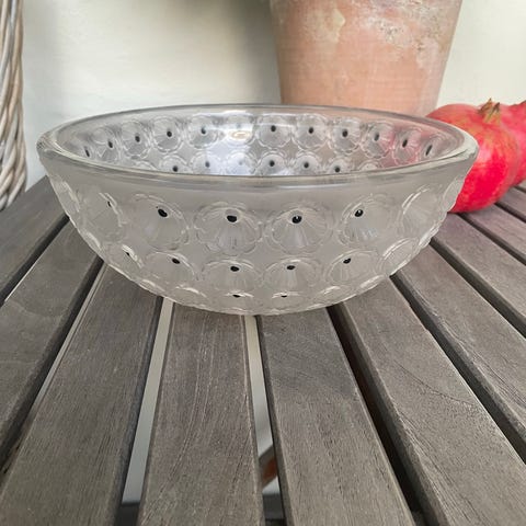 Glasskål, Jan Beranek, Super flot tung glasskål fra ca 60erne af Jan Beranek fra Skrdlovice i klar glas med flot blå kant. Som ny. Meget lidt slidmærker udenpå i bunden. 19,5 cm i diameter, 8 cm høj, vægt 2,182 kg..