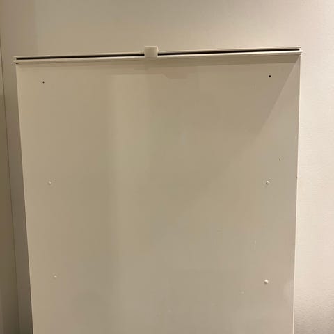 Vægthængt puslebord i metal. Netop købt fra anden , men selv fejlvurderet størrelsen. Fin udenpå, men med gullige skaller inden i (se billeder). Den er ikke forsøgt rengjort.