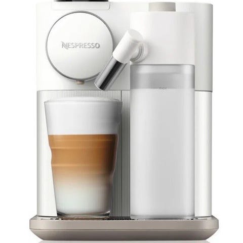 Nespresso Lattissima One kaffemaskine i hvid farve. Maskinen har en kompakt størrelse og inkluderer en mælkeskummer til tilberedning af forskellige kaffedrikke. Strømforsyning via ledning. Designet til hjemmebrug.