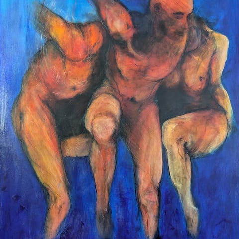 Et stærkt og ekspressivt figurativt maleri af Antoni Adamski, hvor flere menneskekroppe danner en fælles rytme og bevægelse i billedfladen. Figurerne fremstår både individuelle og forbundne, som et studie i fællesskab, balance og menneskelig nærhed.