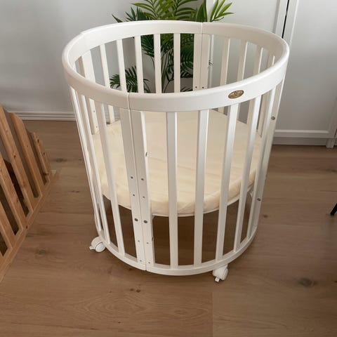 Brugt, men i god stand. Rigtig god at have stående ved siden af sengen, da den ene side kan trækkes op/ned. Kan vugge. Praktisk med de 4 hjul, kan nemt flyttes rundt. Al betræk kan tages af og vaskes. God madras.