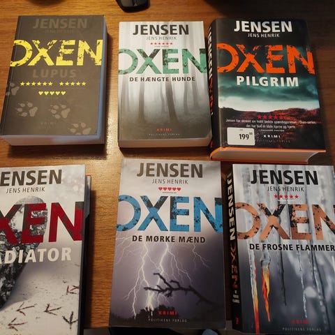 Jens Henrik Jensen Oxen bogserie består af flere titler, herunder 'De mørke mænd', 'De hængte hunde', 'Gladiator', 'De frosne flammer' og 'Lupus'.