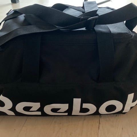 Sort stor taske til sport eller som weekendtaske. 2 store rum med lynlås og plads i midten, samt lille lynlås rum til småting. Fremstår nærmest ny og har ingen skader. I mærket Reebok.