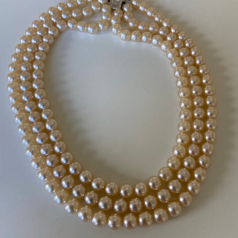 Perlekæde med perlelås. Kæden består af perler med en lukning i form af en sløjfe med en perle i midten.