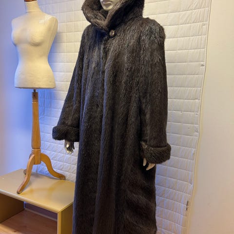 Str 40 . Mange fine detaljer. Sidelommer. Enkelt knaplukning. Lukkes med hægter.. utrolig flot mønster på ærmer og frakke. Lille krave der kan være oppe eller tages ned . Falder meget smukt .