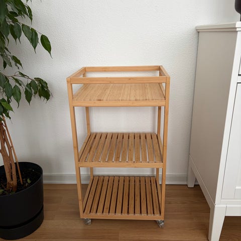 IKEA NISSAFORS rullebord i hvidt metal med tre hylder og hjul.
