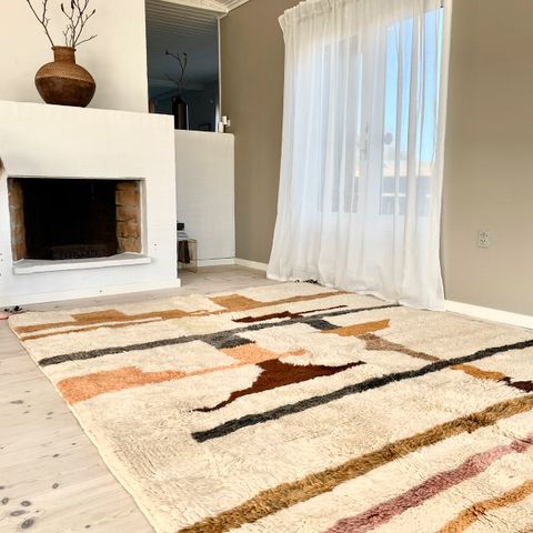Smukt håndlavet marokkansk tæppe i varme, cremede nuancer med et tidløst og elegant udtryk. Tæppet er håndknyttet i naturlig fåreuld af høj kvalitet og er både slidstærkt og behageligt blødt.
