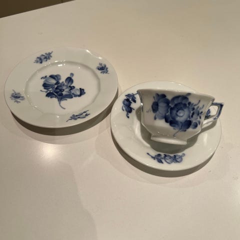 Royal Copenhagen tekop og underkop i porcelæn med blå blomstermotiv. Sættet består af en tekop og en underkop, begge dekoreret med klassiske blå blomster. Tekoppen er ikke helt rund, men super flot.