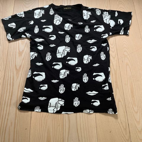 Stine Goya T-shirt i størrelse S til kvinder. T-shirten er hvid og har et mønster med små grønne blomster. Materialet og yderligere detaljer er ikke angivet.