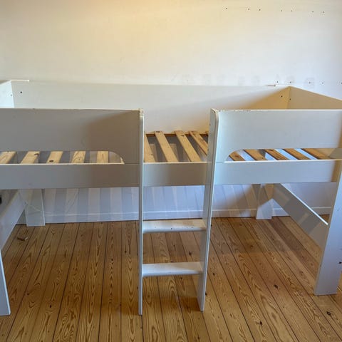 Hvid højseng. Der er gardiner og en lyskæde til underdelen. Vi har dog ikke brugt dem.