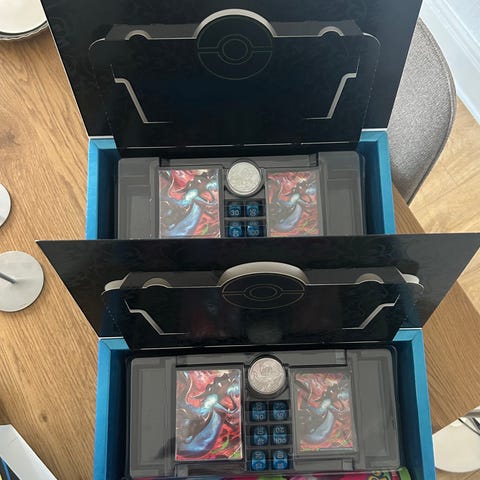 Alt andet udstyr ligger i herunder spillemåtte, tcg live kodekort, terninger, mønt, deck box og sleeves. Det er altså kun pakker og promokort der er taget ud.