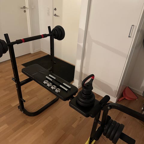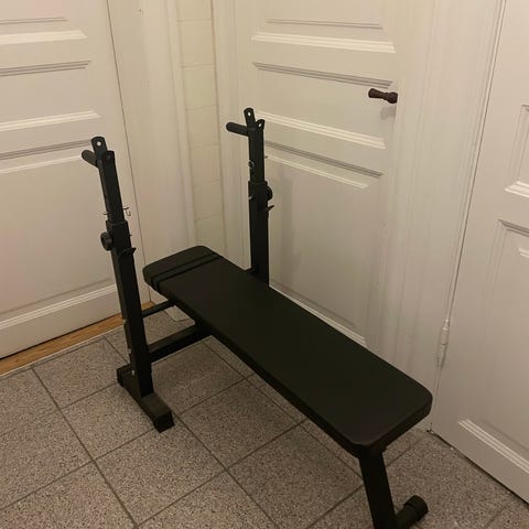Træningsbænk med vægtstangholder og vægte 40 kilo med (afhentes)