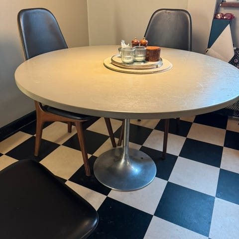 Rundt bord i asketræsfiner, står som nyt. Benene er afkortet af en snedker (fra 74cm til 69cm) - det giver bedre proportioner i forhold til bordets diameter.
