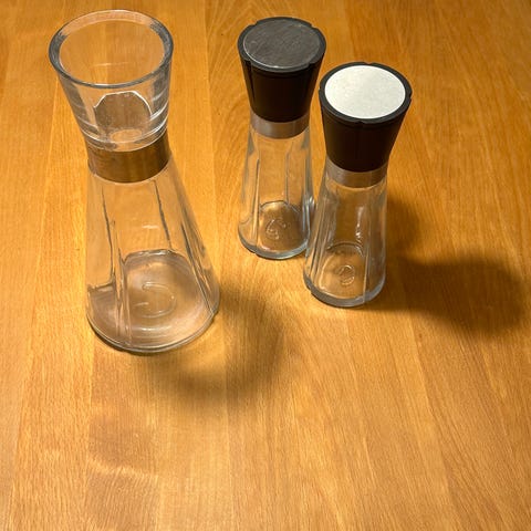 Beholdere til salt og peber har været i opvaskemaskinen, efter billederne er taget.