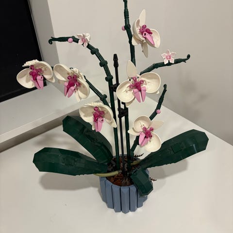 LEGO Botanical Collection orkidé blomster model i plast. Modellen består af flere hvide og pink orkidéblomster med grønne blade og en grå potte. Designet til dekorativ brug. Orkideen står løst i urtepotten og dele ligger løst, så den skal lige samles igen. Jeg sælger for mit barnebarn. Nypris 449,95 kr.