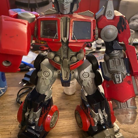 Div. Transformers actionfigurer i forskellige farver og former, herunder røde, blå, orange og gule figurer. Figurenes materialer og størrelser varierer, og de er designet til samling eller leg.