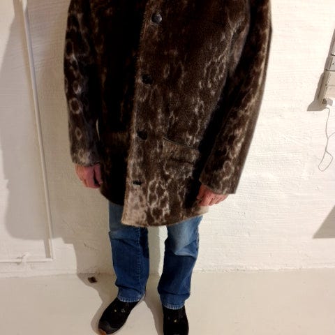 Frakken er lavet af pels med en blød overflade og en kant af sort stof. Der er en rift ved venstre lomme. Usikker på om det er en str 40 eller en str 44.