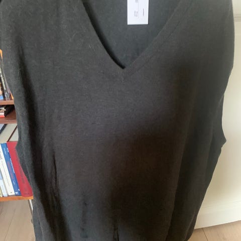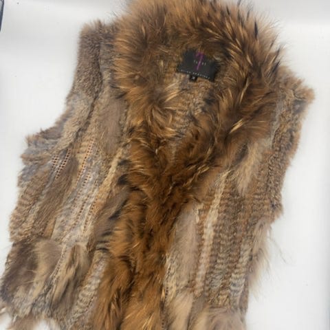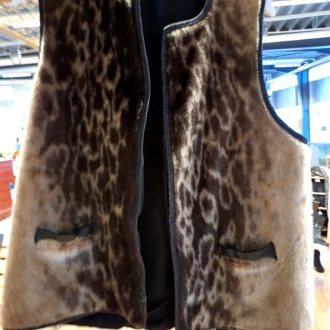 Vesten har en pelsagtig overflade med en glat inderside. Den er i brune nuancer med mørkere kanter. Lommer i en fiks detaljer ,Afhentes i:,Røde Kors Aabenraa (546),Bemærk at mail, chat og beskeder ikke besvares, og varen skal købes på knappen "Gå til varen"