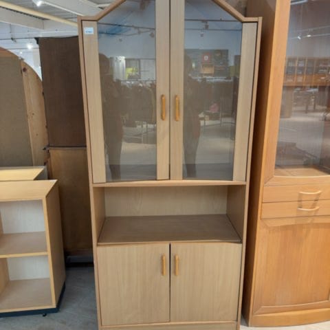 Skabet er i lyst træ med glasdøre og en skuffe. Det giver et klassisk og elegant udseende.,Afhentes i:,Røde Kors Kolding (621),Bemærk at mail, chat og beskeder ikke besvares, og varen skal købes på knappen "Gå til varen"