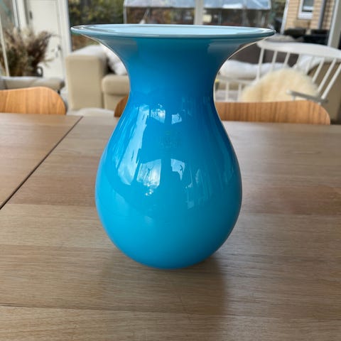 Vasen har en elegant, kurvet form med en bred åbning. Den er fremstillet af glas og har en blank, sort overflade.,Afhentes i:,Røde Kors Holstebro (661),Bemærk at mail, chat og beskeder ikke besvares, og varen skal købes på knappen "Gå til varen"