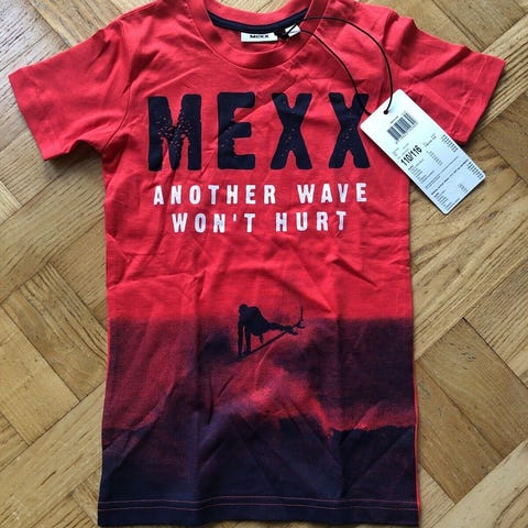 T-shirt, Med V-hals og korte ærmer, Mexx, str. 146, T-shirt med fedt forårsfrisk tryk. Kan egentlig gå til både piger og drenge, men er en anelse figursyet, så købt med hjem til min datter fra Bruxelles.