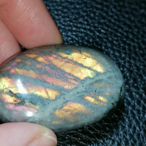Labradorite hjerte med gult flash. Det vejer 78 gr., og måler 4,8x4,2,5 cm.