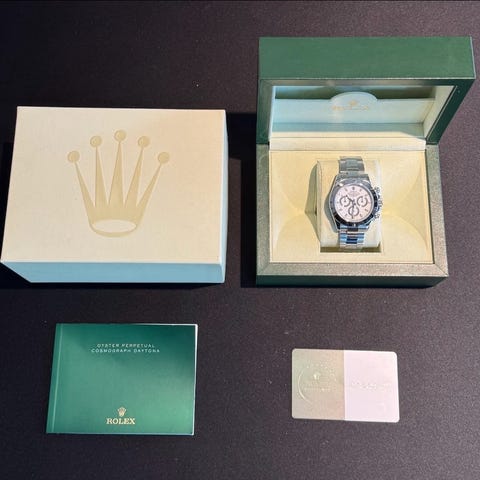Denne Rolex Daytona 116520 er en enestående opdagelse, der praler af en yderst sjælden cremefarvet skive, som elegant har ændret sig til en fantastisk citronfarvet nuance, et fænomen set på kun tre referencebogstaver: P, K og Y. Med al dokumentation intakt og med etiket på bagsiden af kassen, har dette ur oplevet minimal slid,