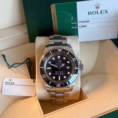 Rolex Sea-Dweller Deep Sea Ref. 116660, 44 mmstål Case med keramisk bezel, automatisk Cal. 3135 bevægelse, sort dial, Oyster armbånd i stål, original æske inkluderet, dokumenter ikke inkluderet, i meget god stand med mindre brugsspor, Swiss Made og fuldstændig original, vandtæt til 3900 m. Klik på den blå "gå til varen" knap, for at købe eller byde på denne vare. Den samlede pris vil blive vist inden du afgiver dit bud.