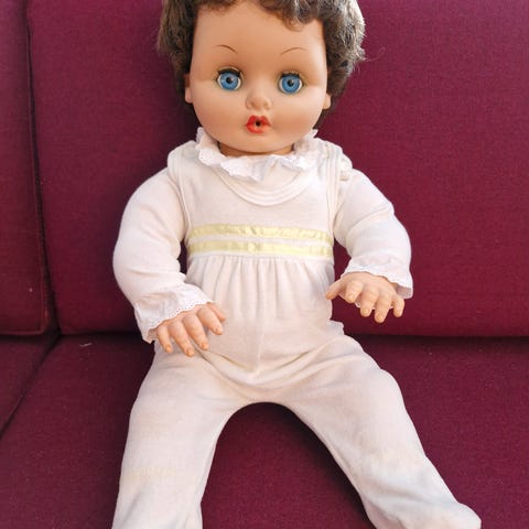 Denne sofa-dukke er lavet i den romantiske stil fra det 19. århundrede og har et unikt ansigt og blik, realistisk og samtidig magisk, tænksom.