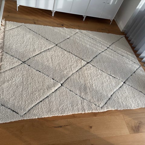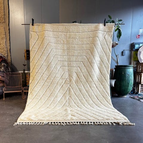 Håndvævet samtids marokkansk Mrirt uldtæppe fra Beni Ouarain, Marokko; 200×300 cm; 100% uld; 21. århundrede; i særdeles god stand og professionelt renset. Klik på den blå "gå til varen" knap, for at købe eller byde på denne vare. Den samlede pris vil blive vist inden du afgiver dit bud.