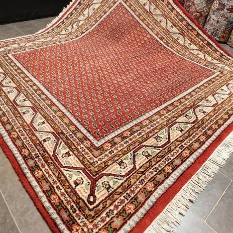 Et ægte persisk tæppe eller orientalsk tæppe som Sarough Mir er verdensberømt for det karakteristiske 'Boteh-mønster' (også kendt som Mir-mønster eller flohmønster). Designet består af en række små, stiliserede palmetter, der er arrangeret i rækker over hele tæppets felt. I Persiens tradition står dette mønster for kontinuitet og tidløs ro. Det giver rummet en struktureret og samtidig meget harmonisk udstråling.