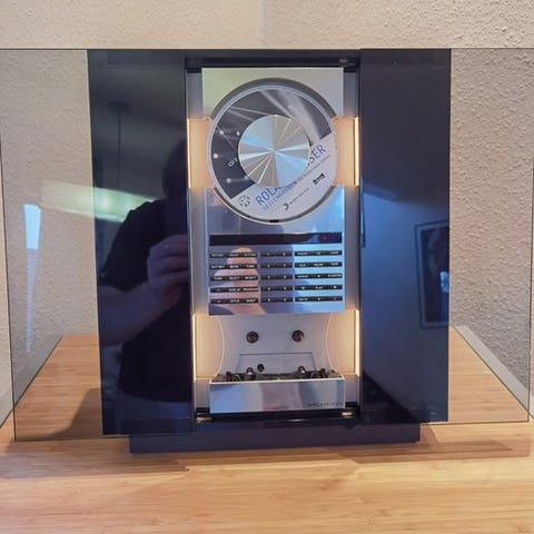 Et ikon bestående af en cd, tuner, låger med nye strenge og en perfekt forforstærker, alt dette er skjult bag to låger, der åbner sig og bliver oplyst af fire lamper, hvis du giver en håndbevægelse som kommando. Vi har ikke repareret kassetteafdelingen, da den alligevel ikke bruges meget længere. Nu kan du alligevel streame alt via din egen WIFI- eller Bluetooth-modul.