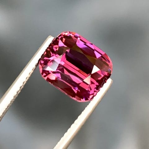 En meget sjælden “neon” pink (let purpurfarvet) spinell udvundet i Luc Yen-distriktet i Vietnam, med en samlet vægt på 4,81 karat.